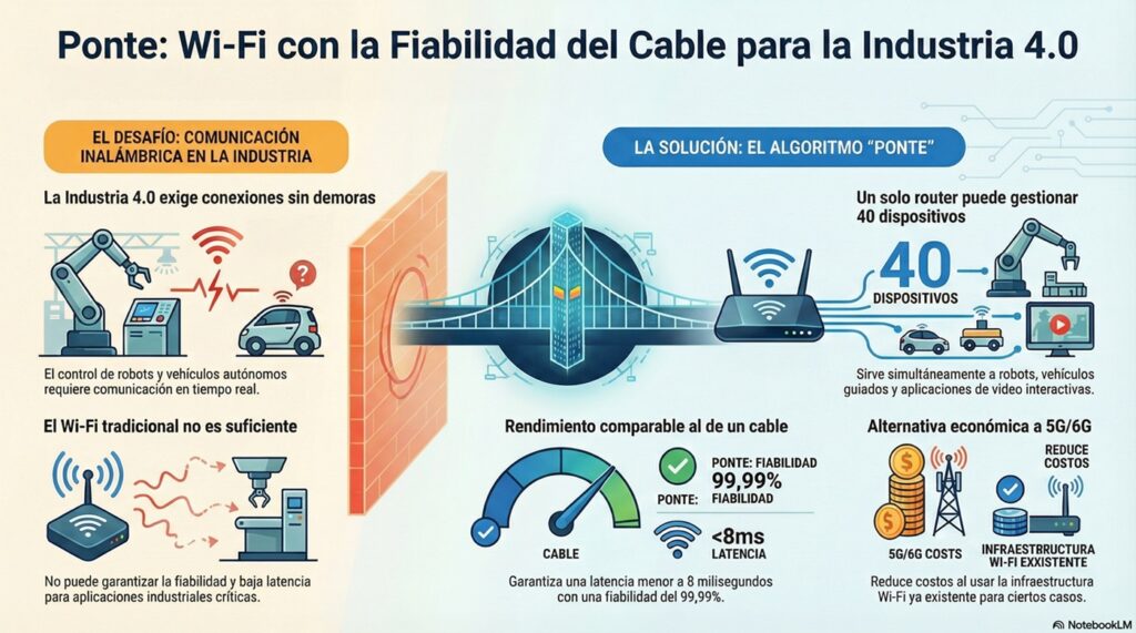 La industria 4.0 ha dado un paso de gigante hacia la total movilidad. Investigadores de la Universidad Carlos III de Madrid (UC3M) y la Universidad Politécnica de Madrid (UPM) han desarrollado un algoritmo innovador llamado «Ponte». Este avance permite que las redes Wi-Fi alcancen niveles de fiabilidad y rapidez que, hasta ahora, solo eran posibles mediante conexiones por cable.